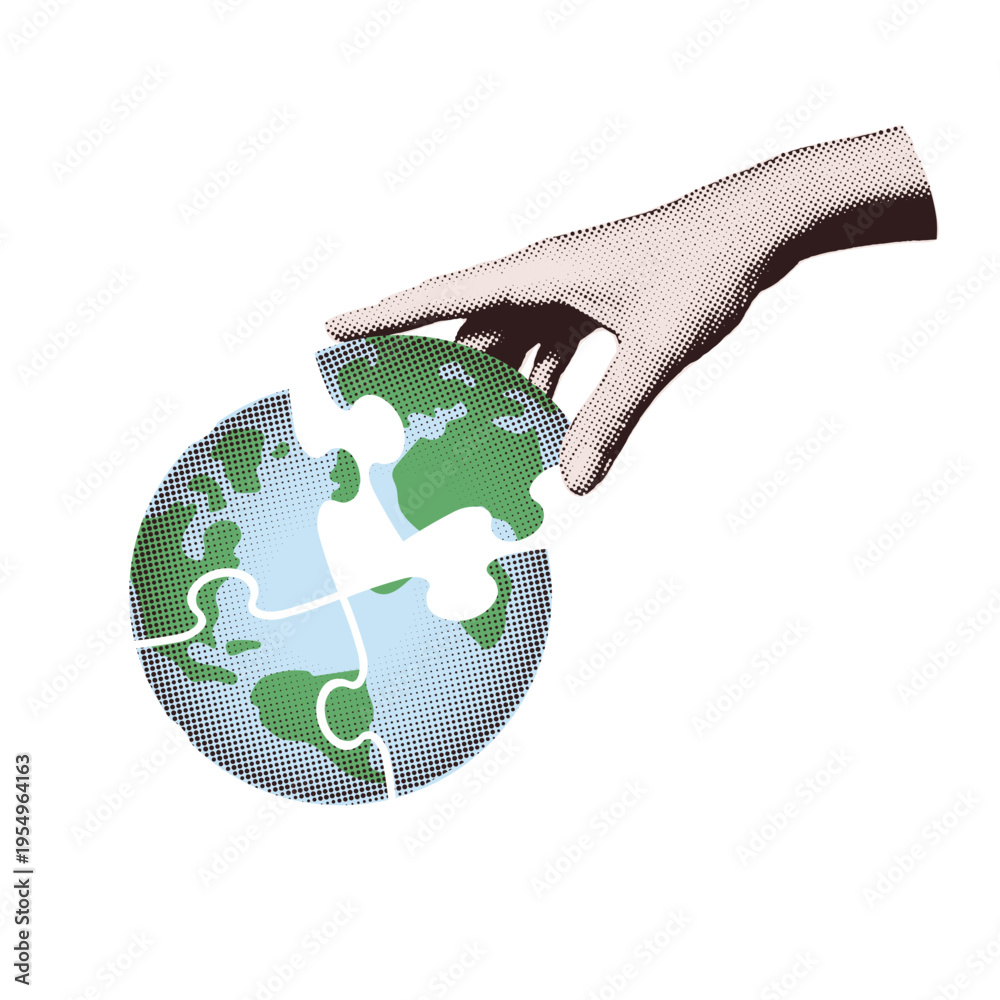 Environmental strategy concept collage. Halftone hand putting the last puzzle piece into green earth globe. Retro pop art vector illustration for sustainable business solution and ecology. #1954964163