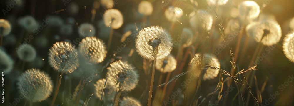 Ephemeral Dreams: Close-up of dandelion clocks bathed in sunlight, the delicate seeds ready to embark on their journey, symbolizing wishes, growth, and the transient beauty of nature. #1800512557