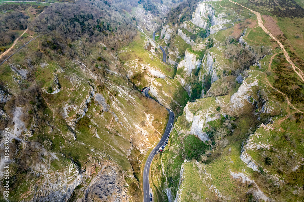 Epic aerial view of Cheddar Gorage, Historical Landmark of Cheddar, village of Somerset, England, uk #1958705674