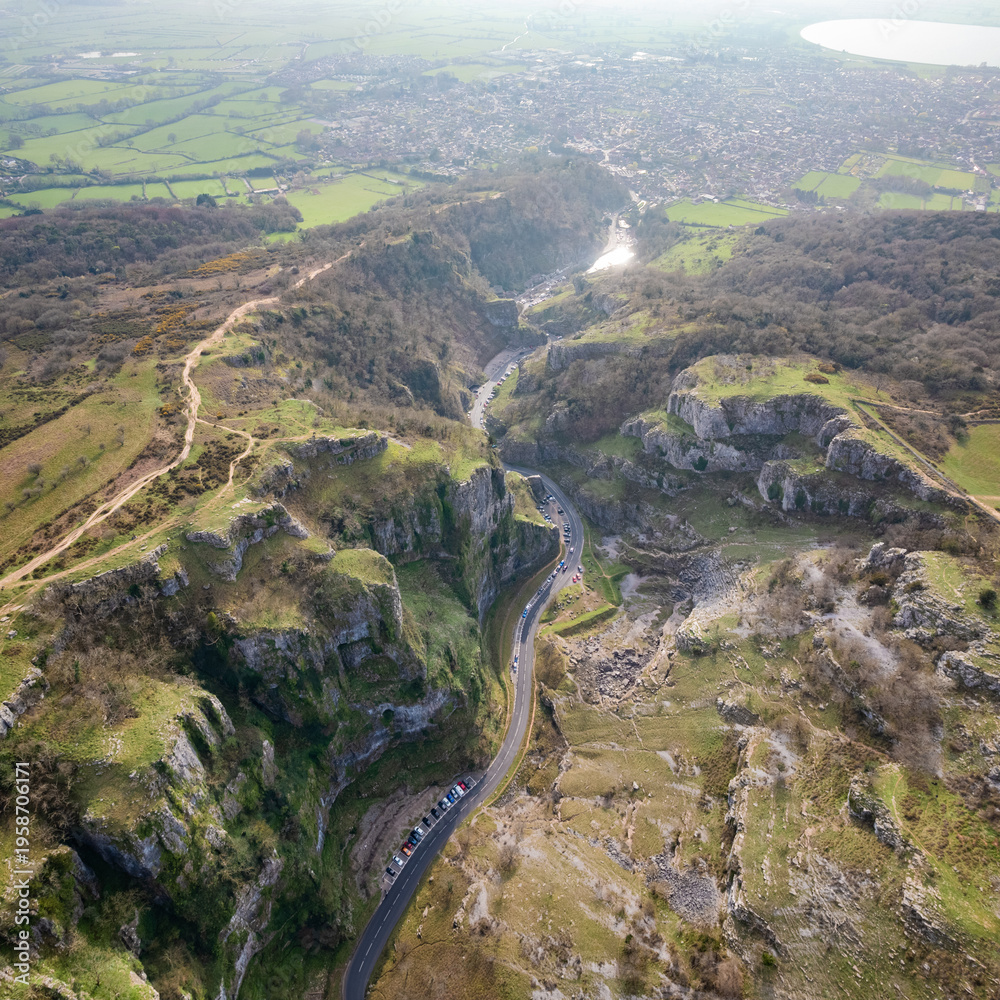 Epic aerial view of Cheddar Gorage, Historical Landmark of Cheddar, village of Somerset, England, uk #1958706171
