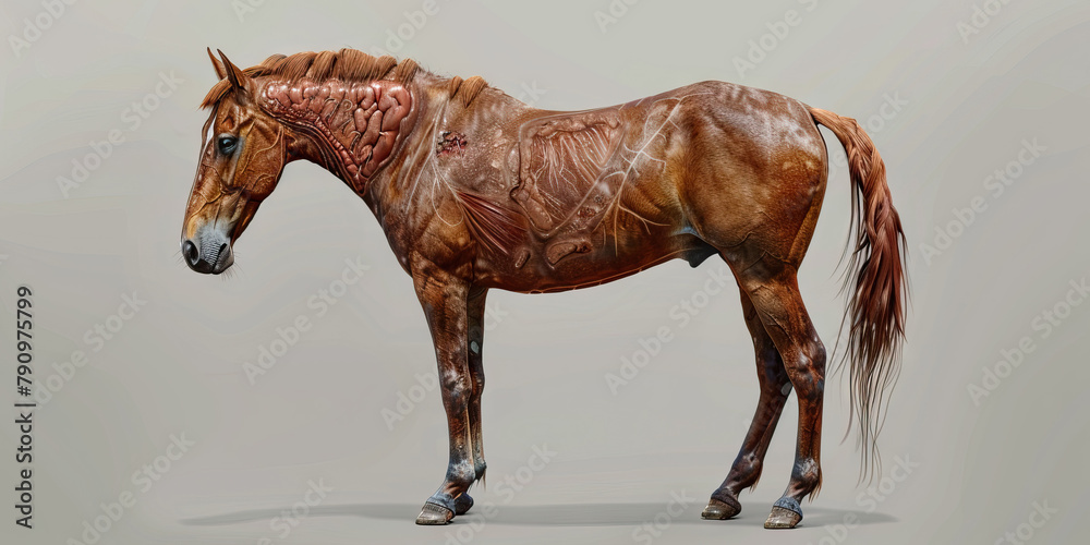 Equine Gastric Ulcers: The Poor Appetite and Abdominal Pain - Picture a horse with highlighted stomach showing ulceration, experiencing poor appetite and abdominal pain #790975799