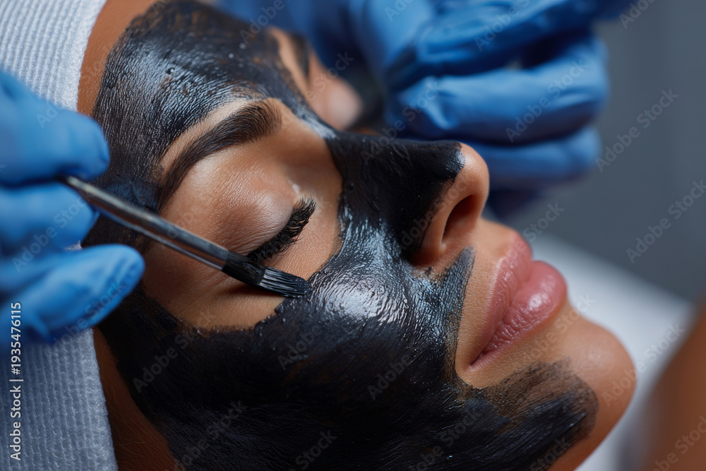 esthetician carefully removing charcoal peel-off face mask from client'scheek, detailed texture realism, soft clinical lighting #1935476115