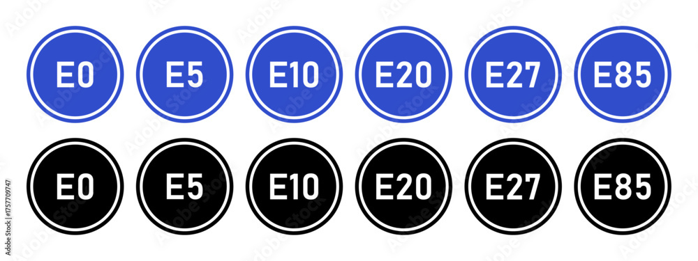 Ethanol fuel labels E0 E5 E10 E20 E27 E85 petrol sticker set vector circle icons. Gasohol bioethanol green alternative fuel badges. #1757709747