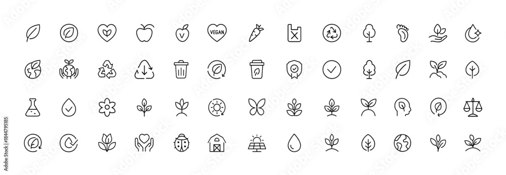 Ethical eco-friendly production line icon set, organic vegan recyclable symbols in thin linear style, clean plastic-free certified non-toxic pictograms, vector illustration, sustainable design, #1844795185