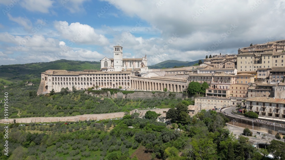 EUROPE, ITALY ASSISI 06,04,2025 The Basilica of Saint Francis San Francesco in Assisi, Umbria.Drone aerial view of Papal Patriarchal Basilica of Saint Francis and the historic city with tiled roofs #1519175540