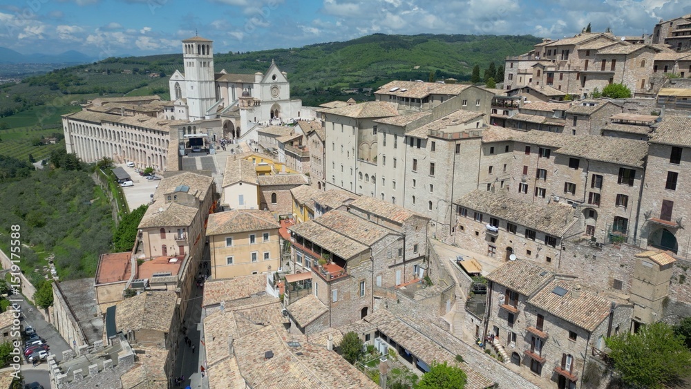 EUROPE, ITALY ASSISI 06,04,2025 The Basilica of Saint Francis San Francesco in Assisi, Umbria.Drone aerial view of Papal Patriarchal Basilica of Saint Francis and the historic city with tiled roofs #1519175588