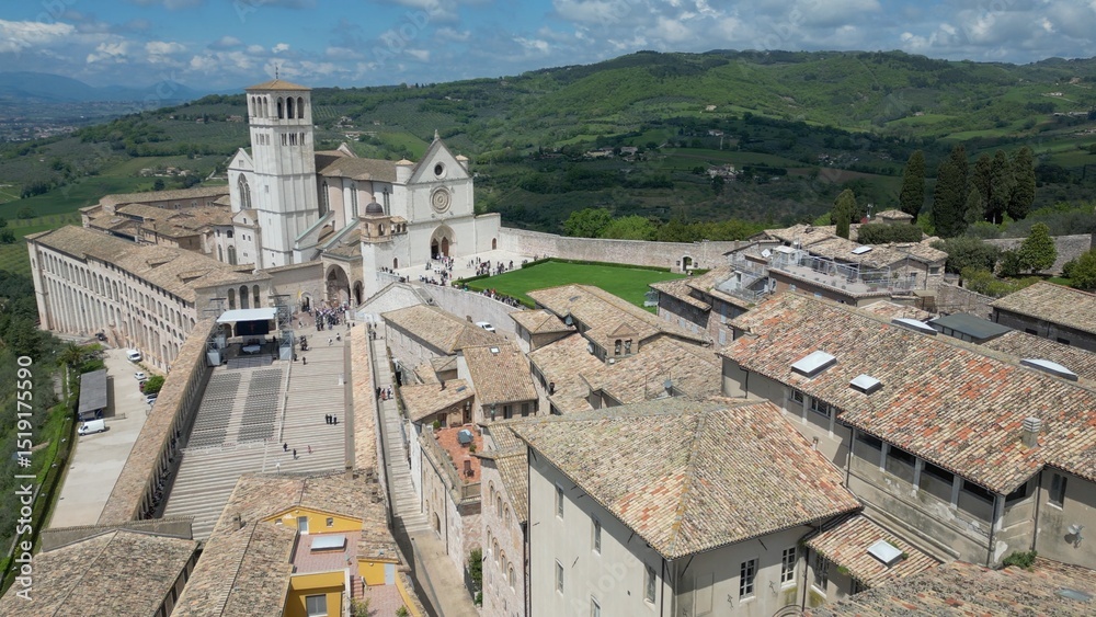 EUROPE, ITALY ASSISI 06,04,2025 The Basilica of Saint Francis San Francesco in Assisi, Umbria.Drone aerial view of Papal Patriarchal Basilica of Saint Francis and the historic city with tiled roofs #1519175590