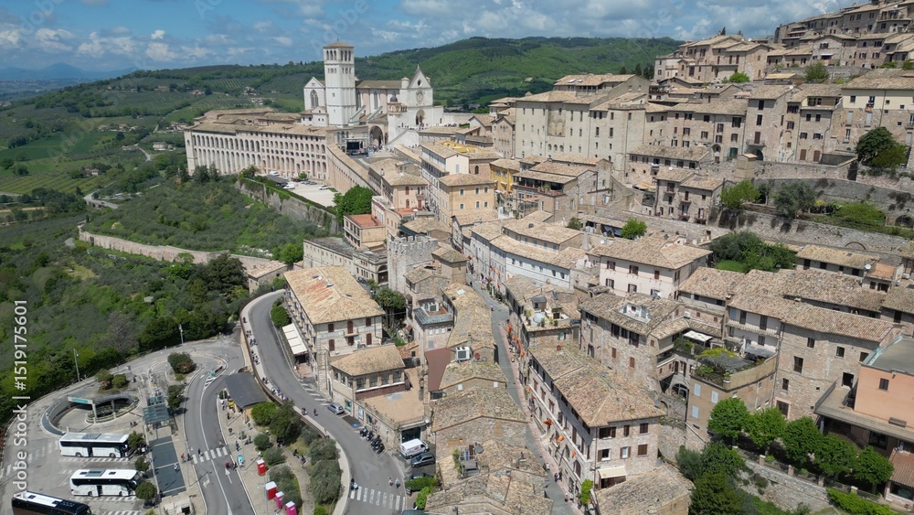 EUROPE, ITALY ASSISI 06,04,2025 The Basilica of Saint Francis San Francesco in Assisi, Umbria.Drone aerial view of Papal Patriarchal Basilica of Saint Francis and the historic city with tiled roofs #1519175601