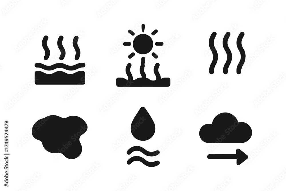 Evaporation Icon Set. Evaporation. Filled icon set of Evaporation: water surface, sun, rising water vapor, #1749524479