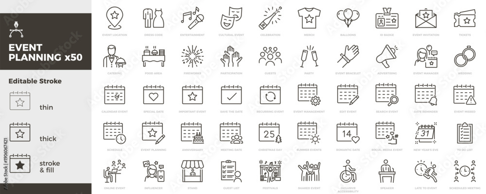 Event planning icon set. Calendar, schedule, invitation, party, celebration, booking, guests, management icons. Thin line editable stroke vector illustrations #1906067421