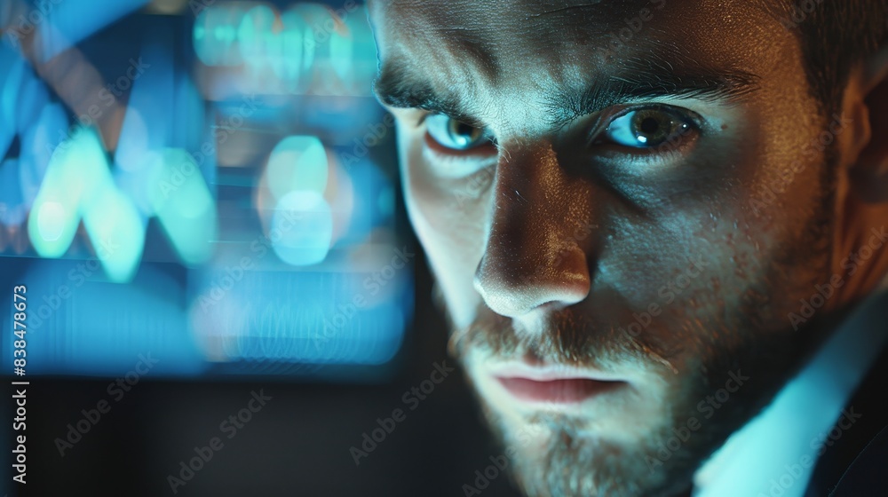 Evident passion in his eyes, blurred projector screen displaying business strategy. #838478673