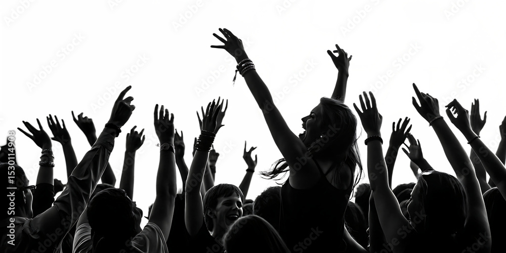 excited crowd with raised hands at concert isolated on a white - background - PNG. GENERATIVE AI #1530114908