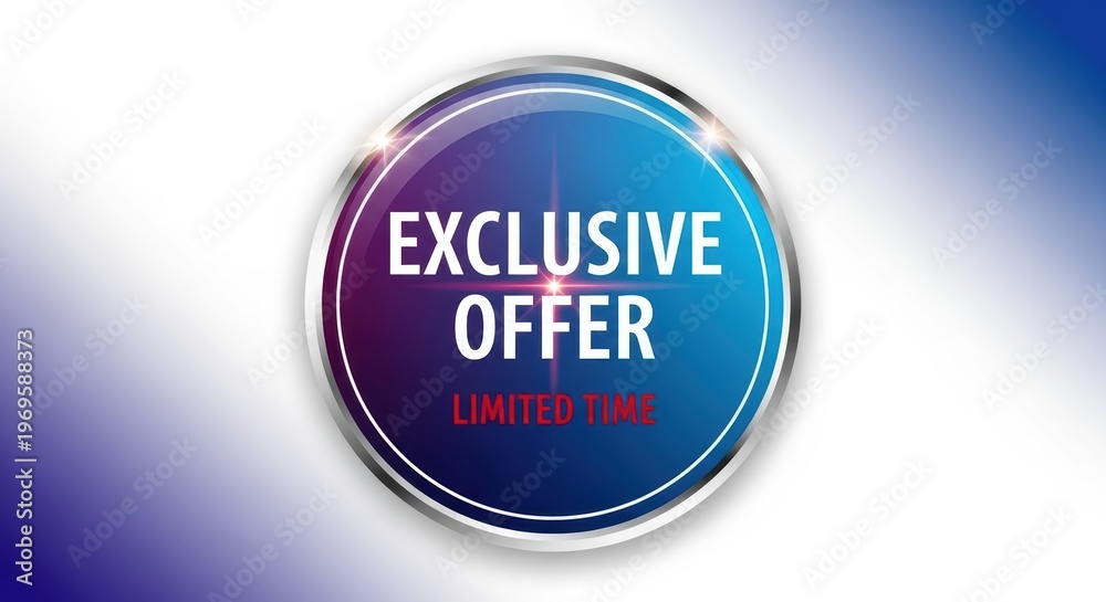 Exclusive Offer badge with limited time text, glossy blue and purple metallic button, premium marketing label for retail sales and promotions #1969588373