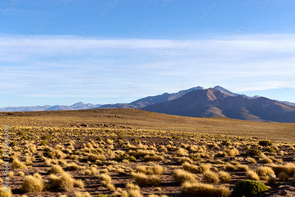 Expansive altiplano shows golden dry grass covering the foreground. Majestic mountains rise in the distance beneath a bright, clear blue sky in Bolivia. #1938602518