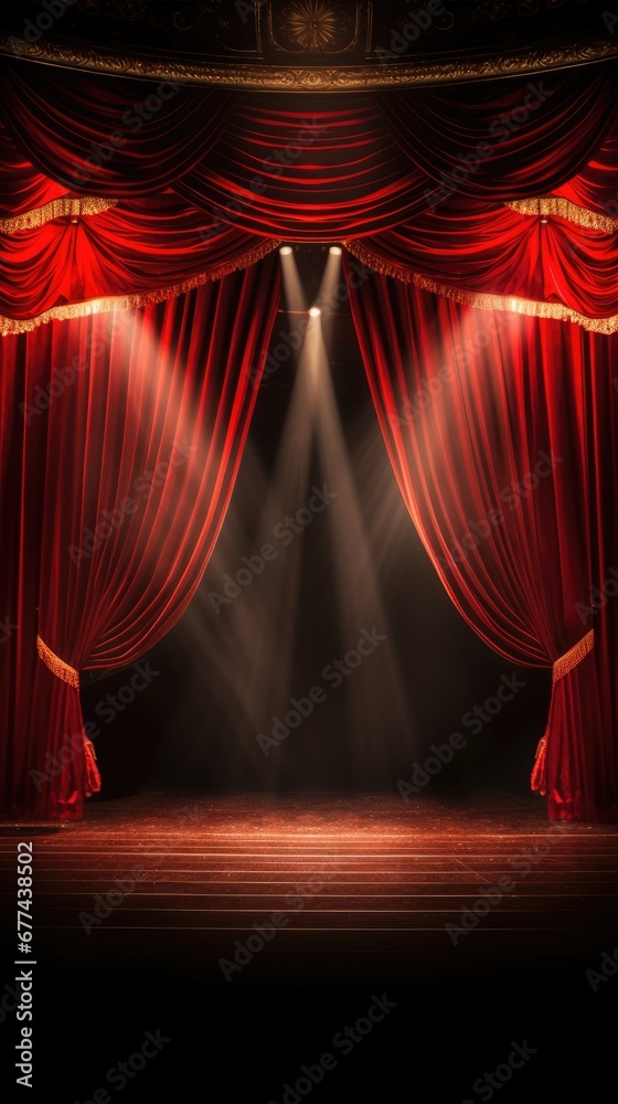 Expansive empty stage, adorned with large red curtains and backdrop, eagerly awaiting performers, setting the scene for an upcoming captivating performance. #677438502