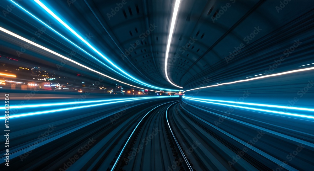 Experience the exhilarating speed of a modern metro tunnel with vibrant blue and white light streaks blurring past, showcasing futuristic urban transit and dynamic motion. #1795882580