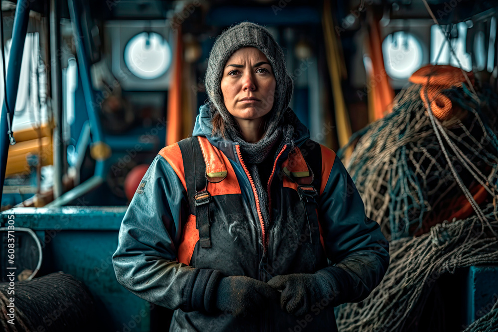 experienced female fishing boat captain, woman in profession, Generative AI #608371305