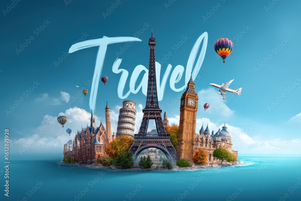 Explore famous landmarks around the world with vibrant designs capturing the essence of travel and adventure in a creative landscape #1612871928