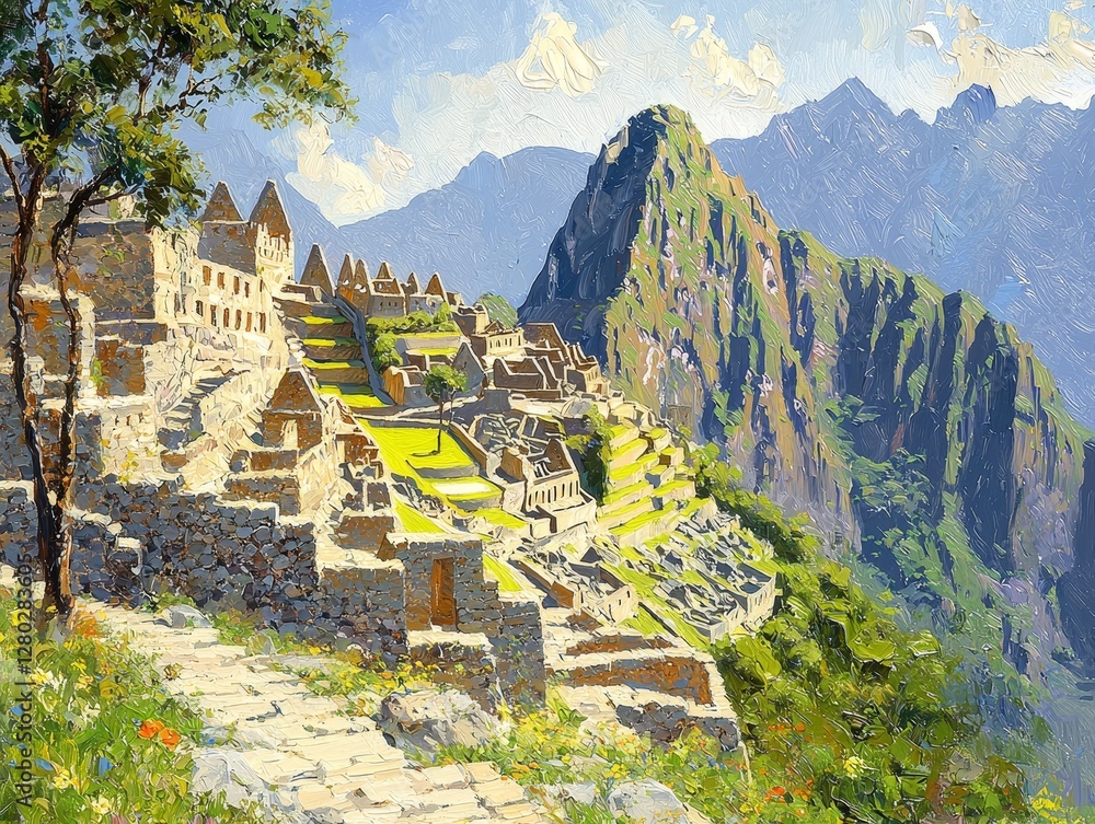 Exploring ancient inca ruins machu picchu oil painting mountainous terrain panoramic view historical significance #1280283605
