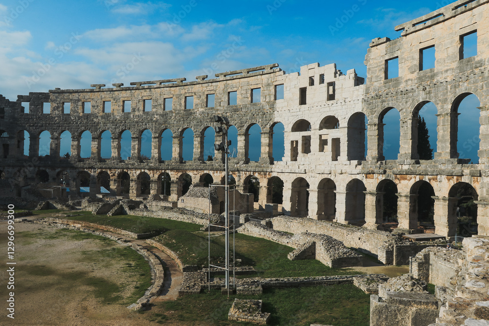Exploring the ancient architecture of Pula Roman amphitheater during a clear day in Croatia #1296699300