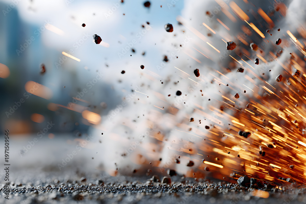 Explosion in a city scene with light leak effect and scratch dust details creating a dynamic visual moment in time #1971509546