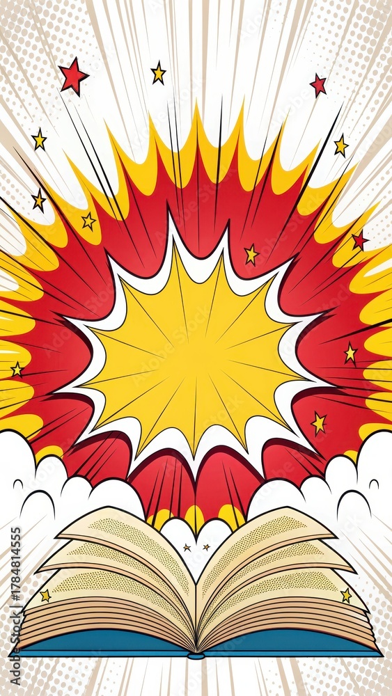 Explosion of colorful comic book pages with yellow and red hues against a bright white background #1784814555
