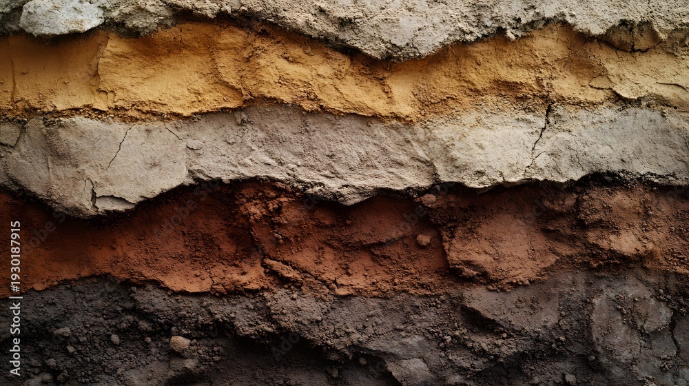 Exposed soil profile showing distinct horizontal layers with varying colors and textures providing geological insight into earth composition and formation over time. #1930187915
