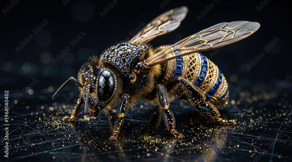 Exquisite macro photograph of a honeybee adorned with luxury jewelry, featuring gold latticework, blue sapphires, and black diamonds on its body, resting on a dark reflective surface with gold dust. #1968140402