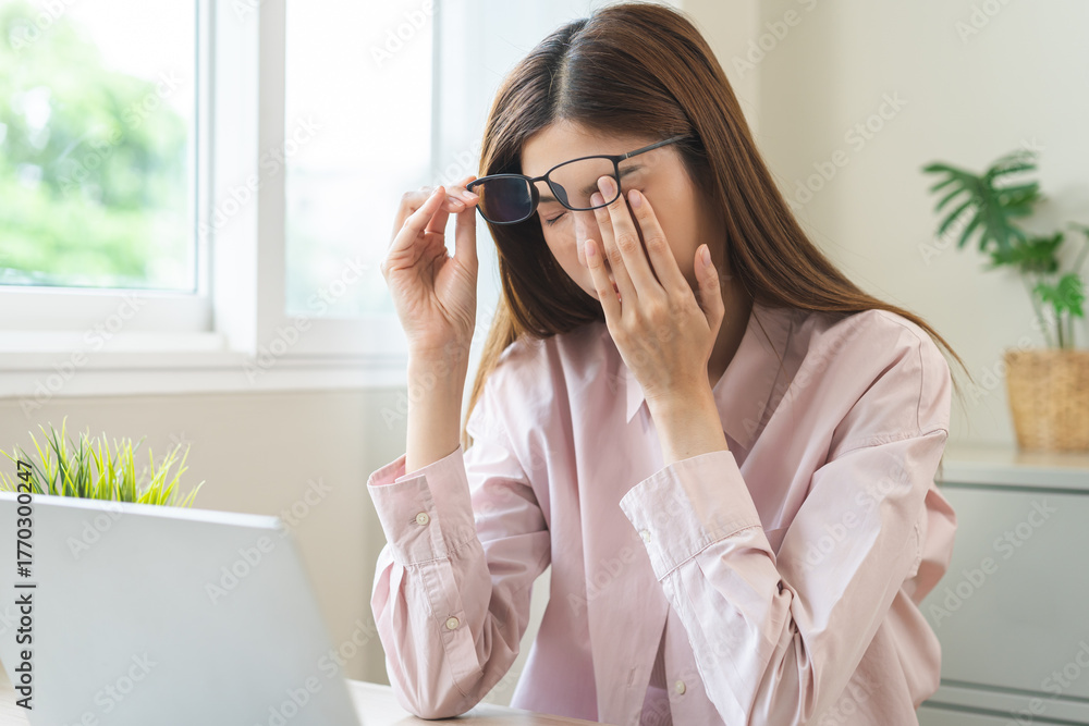 Eye problem concept, fatigue asian young woman tired eyes, irritated rubbing nose, relief vision pain after work on laptop computer, eye strain, hand holding glasses, suffer migraine, bad blurry. #1770300247