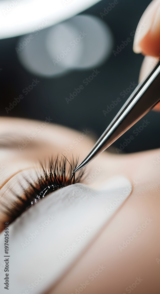 Eyelash Extension Procedure Close Up with Tweezers in Beauty Salon #1974056918