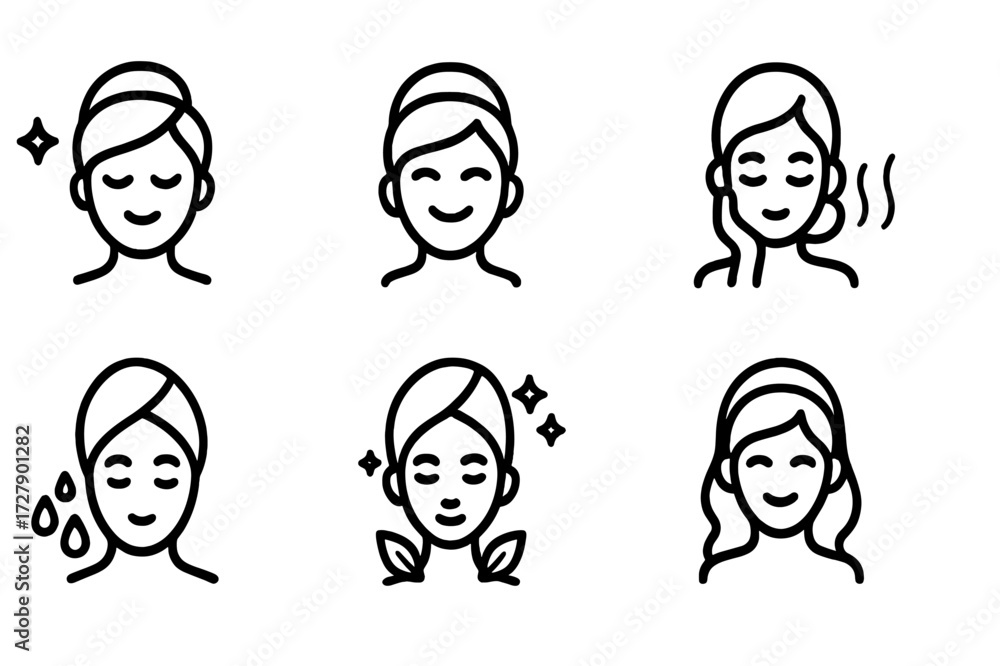 Face Care Emotions Icons. Solid, filled icon set of face care related emotions: confidence, happiness, calmness, relaxation, freshness, glow, vitality, beauty. #1727901282