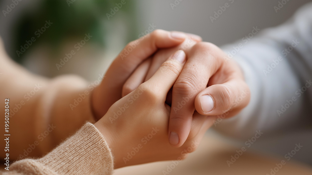 Faceless person's hand gently holding the hand of someone with mental health struggles, supportive and warm touch, defocused neutral interior behind, mental health helping hand, unrecognizable #1950128042
