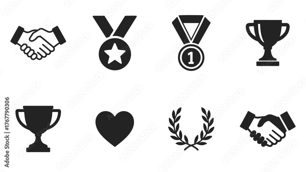 Fair Play Icons — general sportsmanship symbols in black and white handshake, medal, trophy, heart, laurel wreath #1767790306