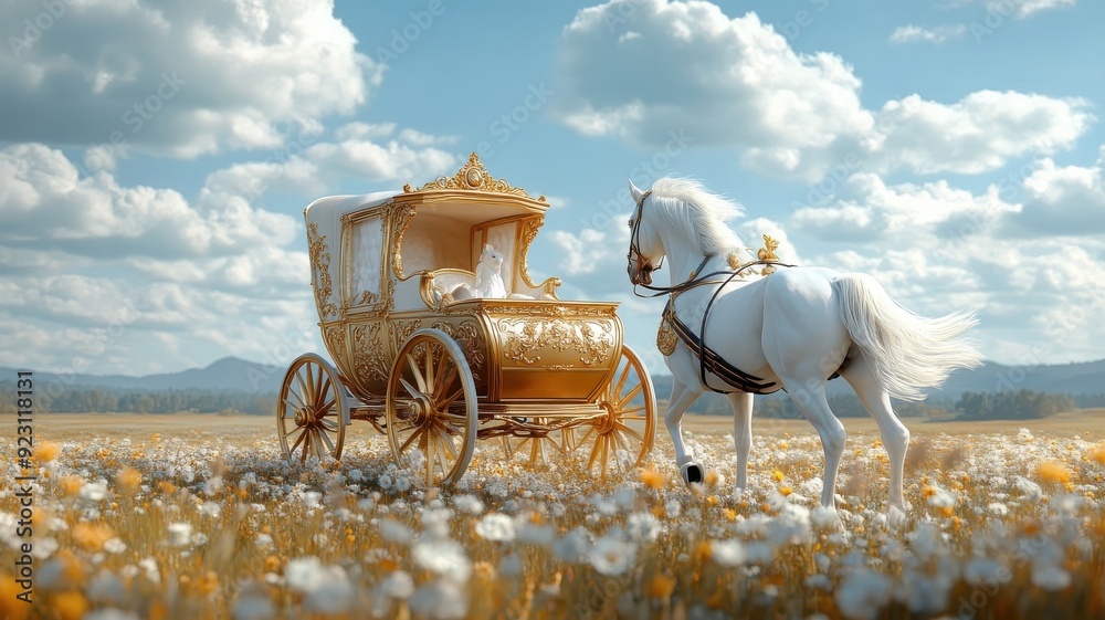 Fairy tale scene with golden carriage drawn by white horses in sunlit meadow. #923118131