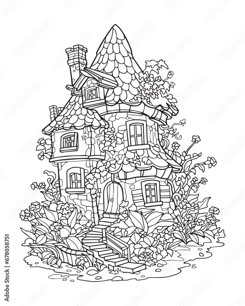 Fairytale house in the forest, black and white coloring, vector #678058751
