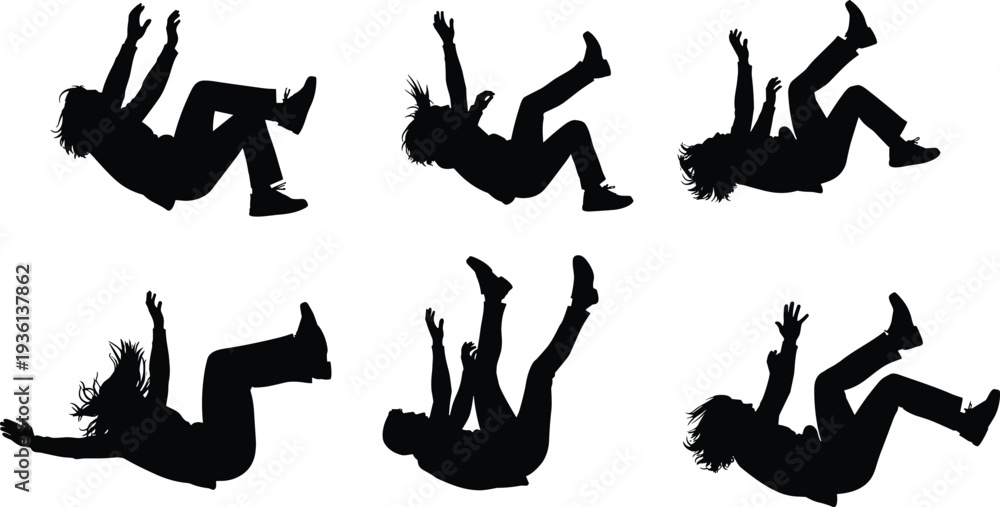 Falling person silhouettes set, human falling poses collection, accident or jump motion silhouettes, people fall action vector illustration #1936137862