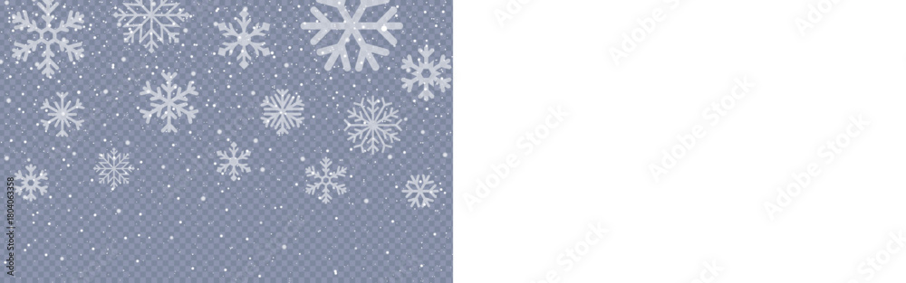 Falling snow and frosty snowflakes isolated on transparent backdrop, ideal for holiday graphic design and seasonal illustration. Transparent snowflake background. Falling snow overlay. #1804063358