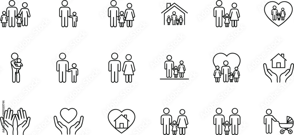 Family And Parenting Line Icon Set With Parents Children Home Heart Support Care Baby Stroller And Community Symbols #1889389744