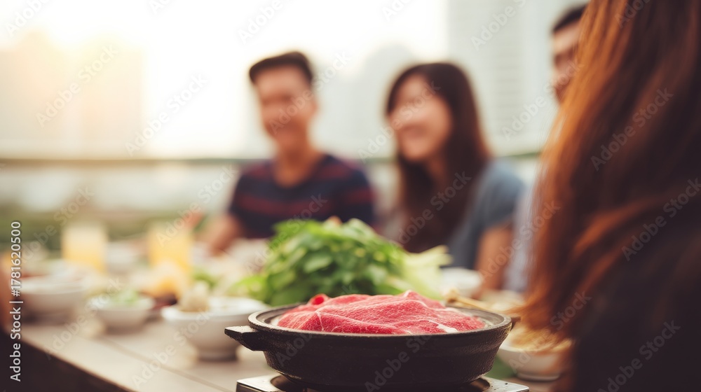 Family laughing around a hotpot meal in open-air setting #1781620500