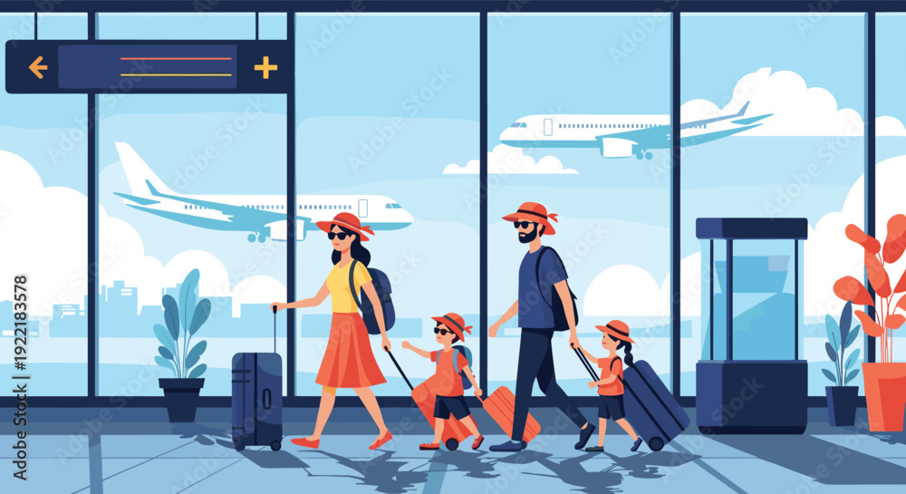 Family of four with suitcases walking through an airport terminal with large windows showing airplanes on the runway outside in the sun. #1922183578