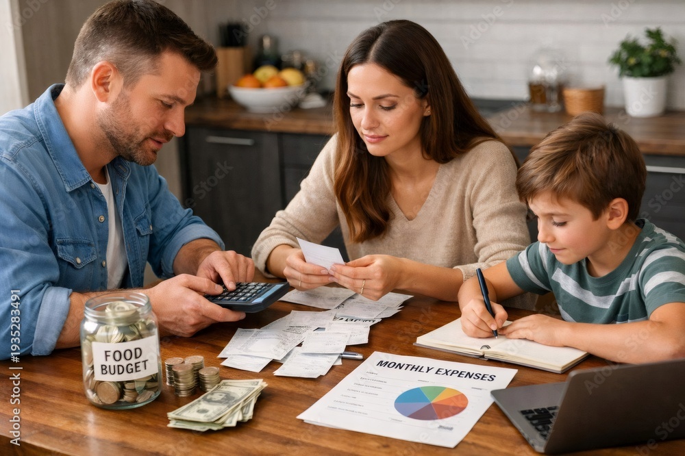 Family parents and son at kitchen table calculating household budget, reviewing bills and savings plans together to manage expenses and secure the familys financial future #1935283491