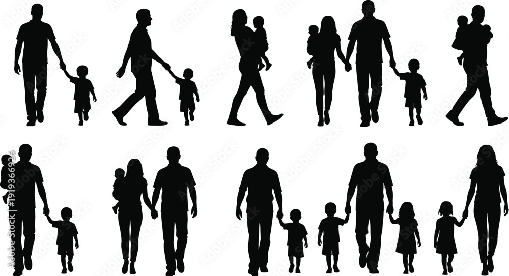 Family silhouette illustration, parent and child artwork, diverse family design vector, unity composition, companionship symbol, caring relationship concept #1919366926