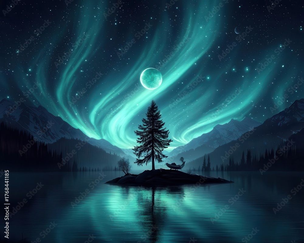 Fantasy landscape with oversized moon and aurora skies, surreal blend #1768441185
