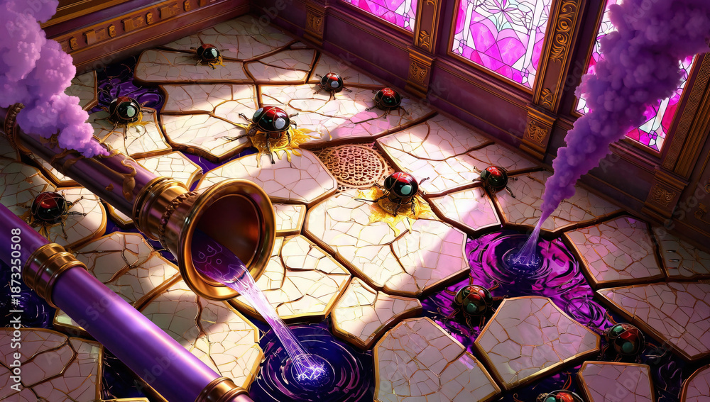 Fantasy Scene with Purple Smoke and Insects in a Cracked Stone Room with Stained Glass #1873250508