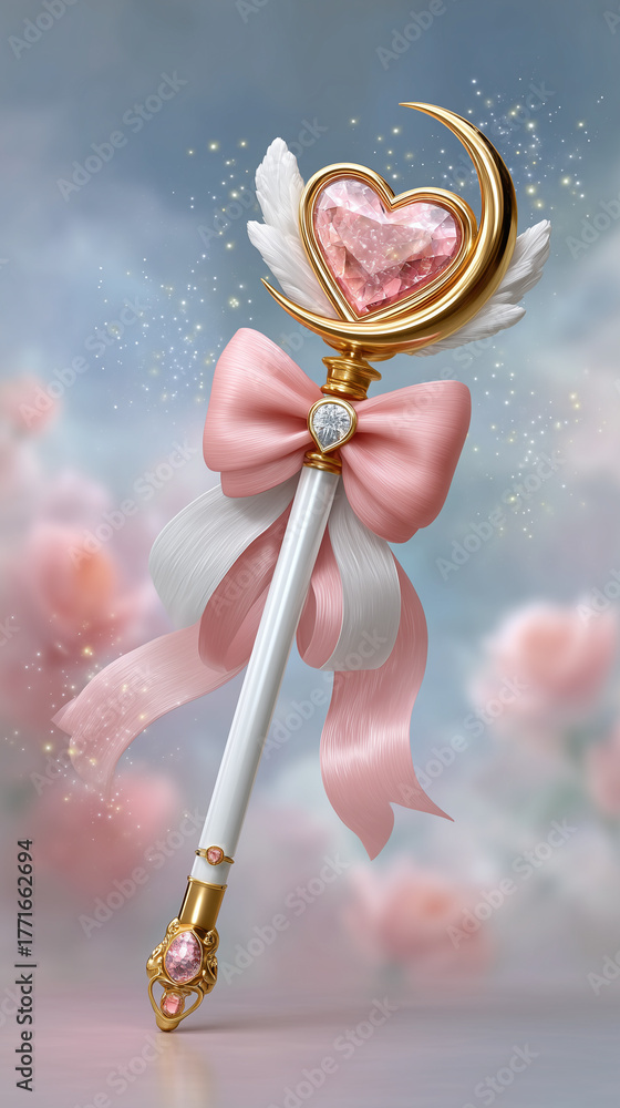 Fantasy-style magical wand with a crescent moon and shimmering pink crystal centerpiece. Surrounded by glowing particles, silky ribbons, and golden touches — creating a bright and cute kawaii atmosphe #1771662694