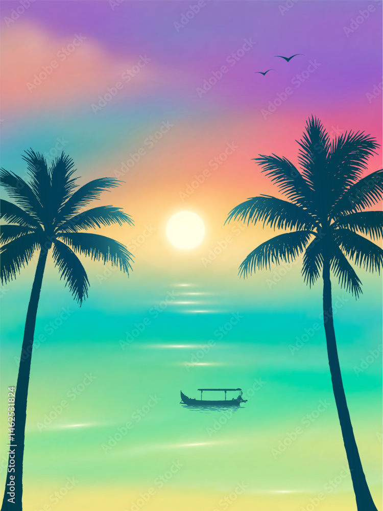Fantasy Tropical Sunset with Palm Trees Silhouettes and Small Boat on Sea, Vibrant Gradient Sky in Summer Paradise Landscape, vector illustration #1462531824