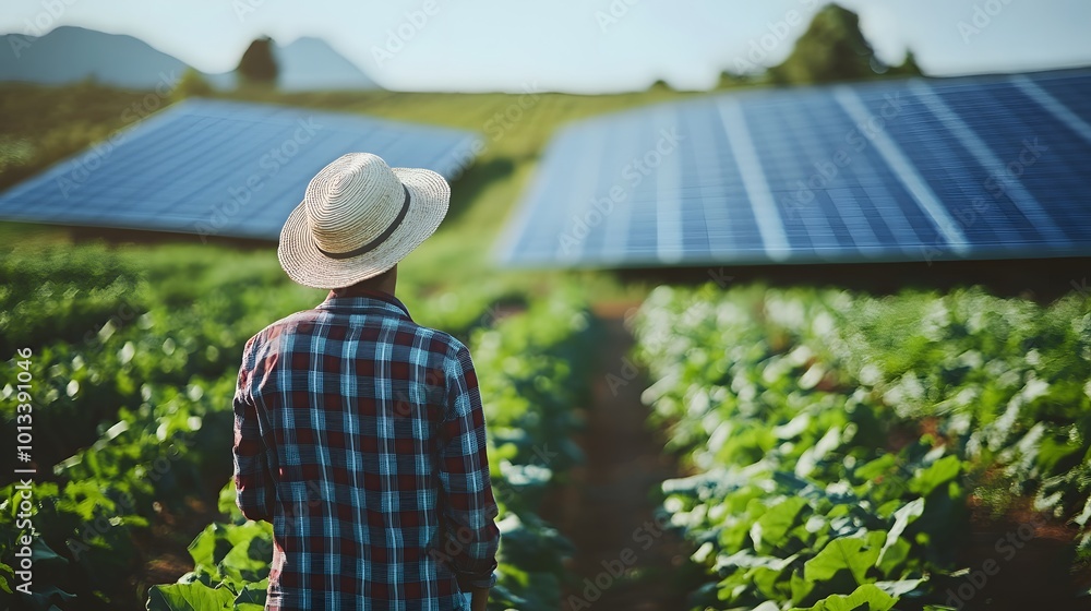 Farmer inspecting solar panels and crops on farm #1013391046