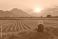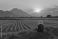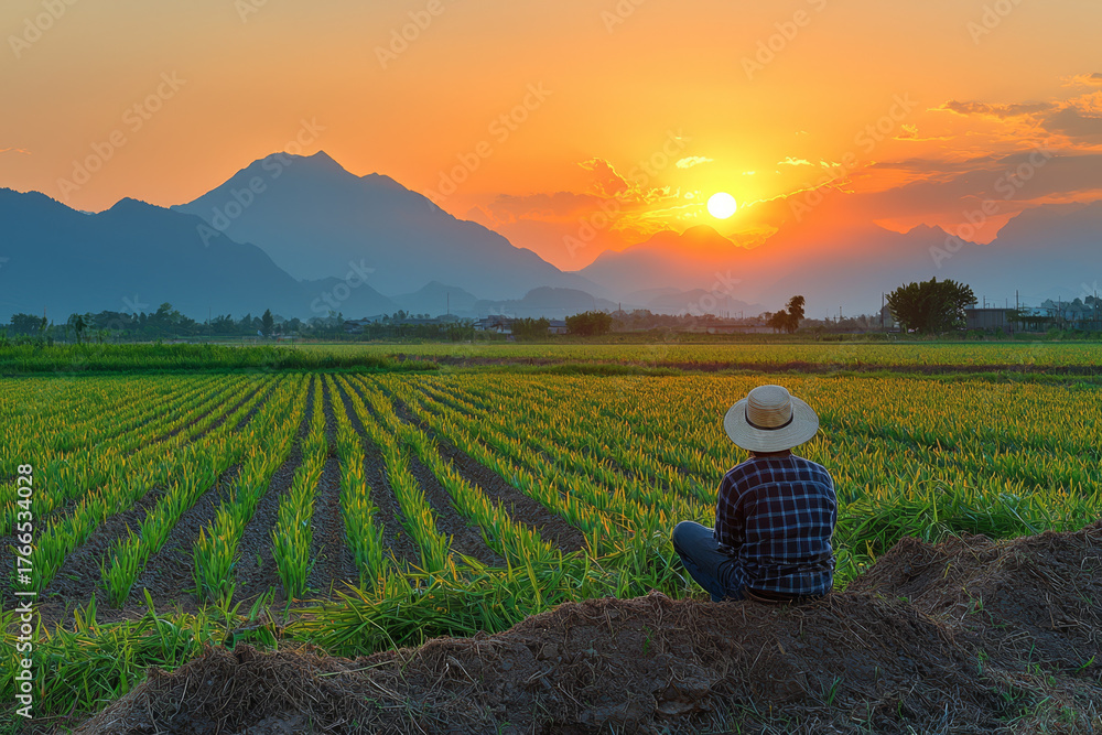Farmer watching a vibrant sunset over a neatly tilled field and distant mountains. #1766534028