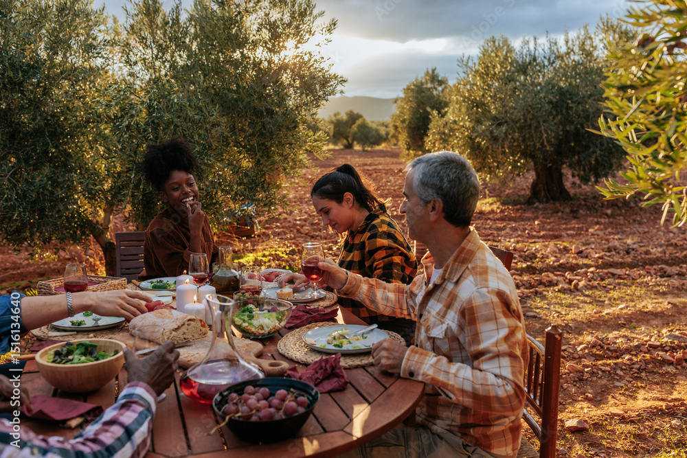 Farmers enjoying dinner together at olive grove after harvesting olives #1516134640