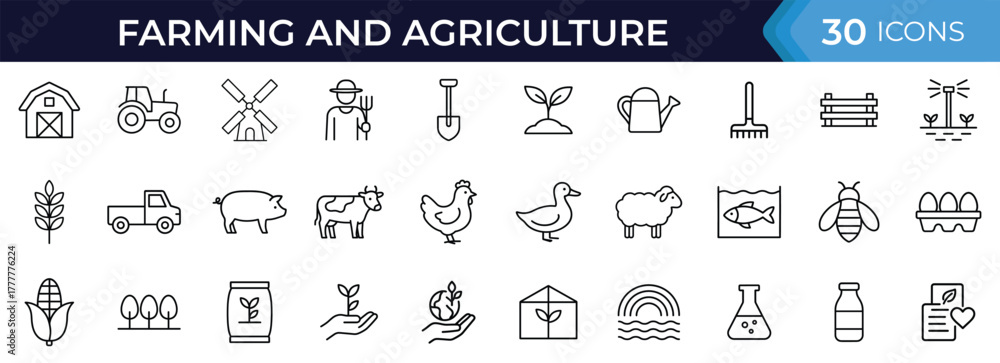 Farming and agriculture glyph icon set. Vector pictograms of tractor, barn, livestock, crop cultivation, organic produce, greenhouse, irrigation, and sustainable farm black silhouette illustration #1777776224